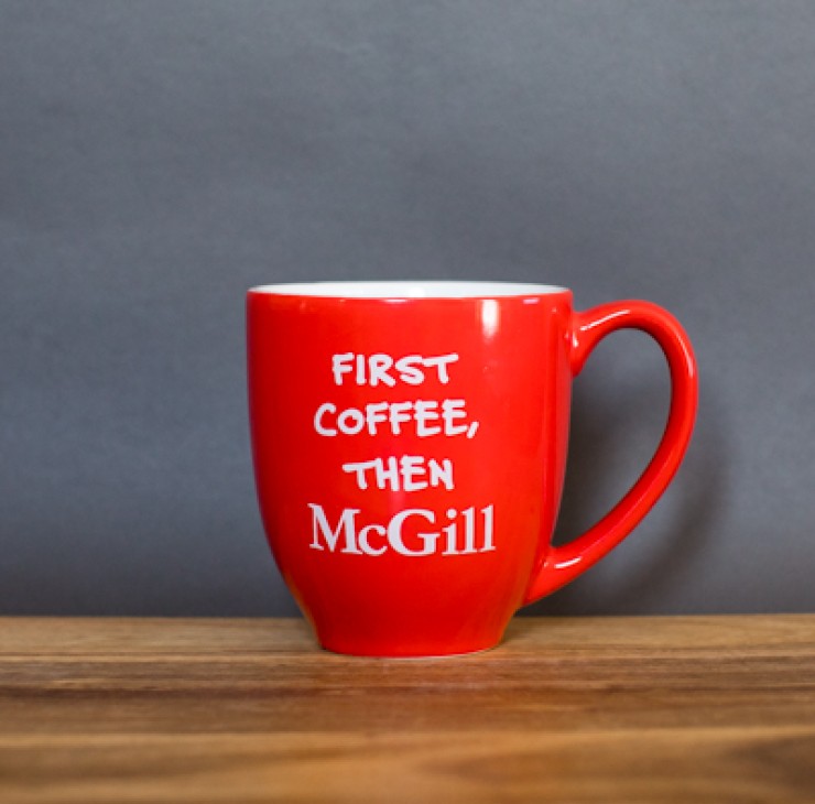 First coffee, then McGill. Start you day off right when you drink from this 16oz ceramic mug. Red exterior, white interior, with First coffee, then McGill decal front and back. Dishwasher and microwave safe.