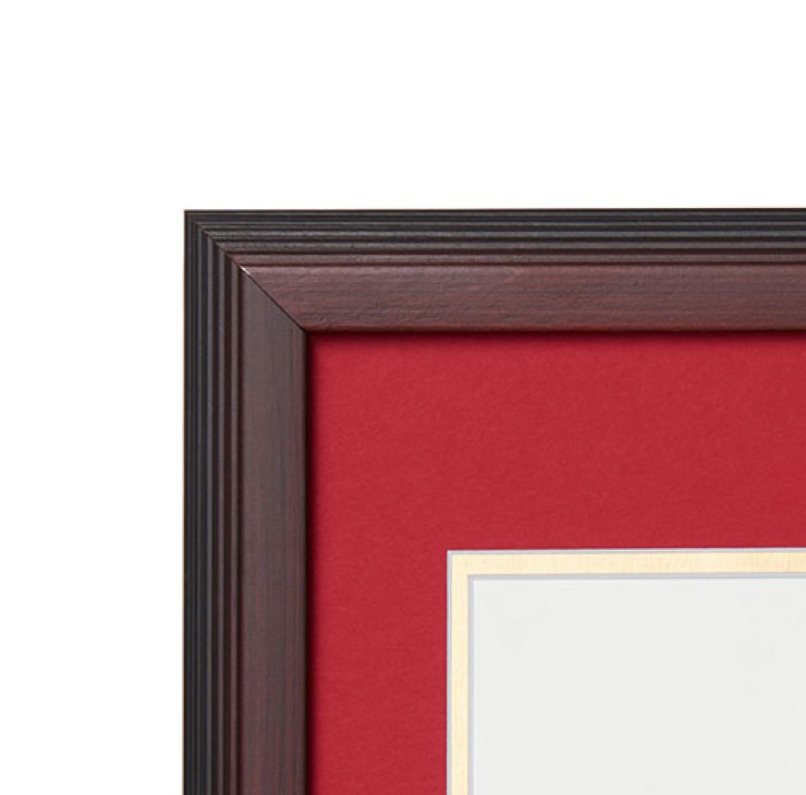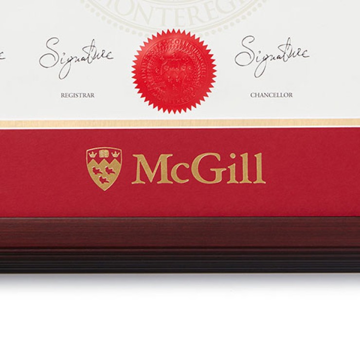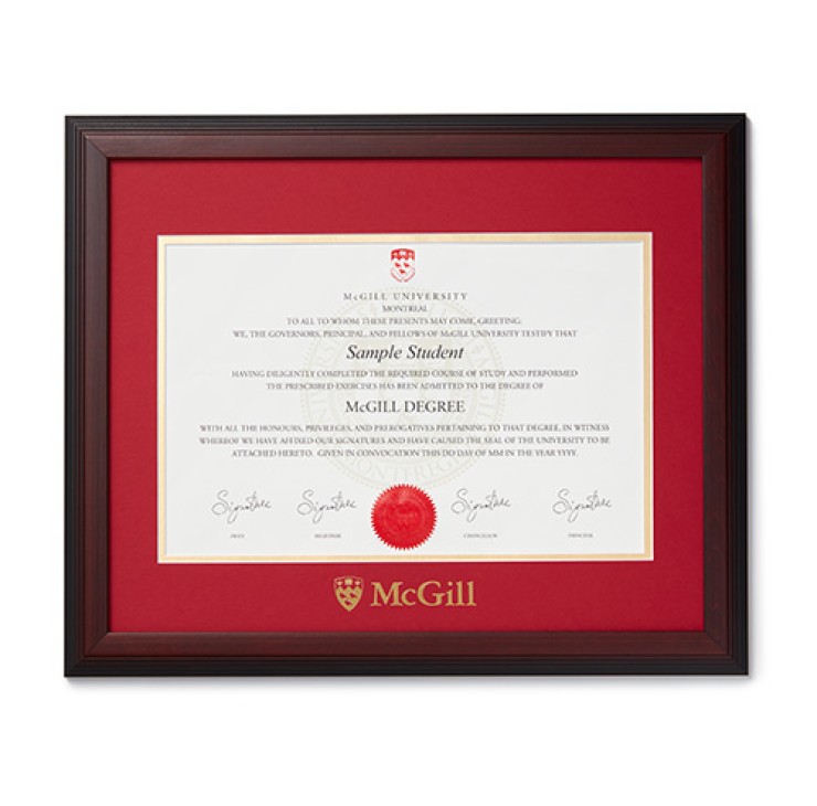 Finely crafted wooden frame with multi-step beveled edging. Treated with deep burgundy stain and aged for an authentic look. Red acid-free paper mat features gold foil-stamped McGill wordmark with crest and painted gold fillet trim. Easy mounting and installation. Measures 19 1/2 by 23 1/2 inches and holds an 11 by 17-inch horizontal diploma.