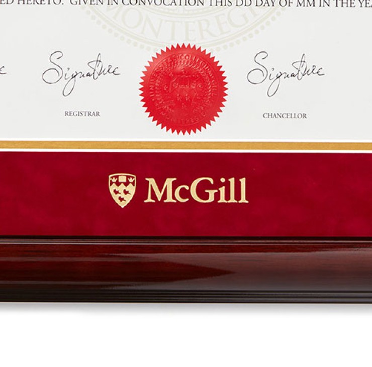 Finely crafted mahogany wood frame with red suede, gold mat, and embossed McGill Logo. Measures 19 by 23 inches and holds 11 by 17-inch horizontal diploma.