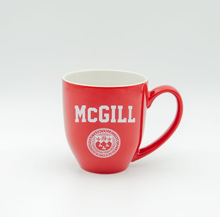 This large capacity bistro style mug holds 16oz and has a red exterior and white interior. The McGill wordmark and varsity style logo is featured on the front and back.